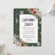 Elegant green buffalo plaid Christmas party invitation featuring white poinsettia, holly, red berries and snowflakes.
