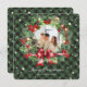 Elegant green photo Christmas card featuring a photo surrounded by a watercolor wreath of berries, holly, pine cones and conifer tree branches. Easily personalise this classic photo holiday card with your photo, family name and text.