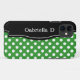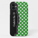 Stylish iPhone 5 case designed with a white polka dots over green pattern, a black frame over the left side, and personalised with your name or custom text in white across the black frame. This design is perfect for vertical and horizontal use of the iPhone 5.