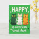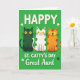 Designed with three stylized cats lined up side by side on an emerald green background, this St. Patrick’s Day scene feels like a friendly group photo with a hint of cozy closeness 💚. The left cat is deep forest green with darker spots, the middle cat is white with lime green polka dots, and the right cat is warm orange with small cherry red speckles. Their wide yellow eyes and little upturned smiles give the impression they’re sharing a private joke, leaning into each other with easy companionship. Small white shamrocks are scattered around them like confetti, adding a classic holiday touch ☘️. The word “HAPPY” appears in white at the top, centered above the cats. Along the bottom, white text reads “ST. CATTY’S DAY Great Aunt,” stretching across the lower area beneath their faces. The overall look stays flat and graphic with bright, even lighting, and the white shamrocks dot the green space around the trio.