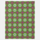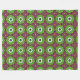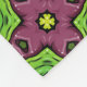 "Two towels and a washcloth with a geometric floral pattern in green, purple, and white. The design features repeating hexagons and flowers."