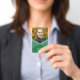 A modern photo badge featuring a green layered geometric design on the front where you can also add your photo and a purple colour back side. Perfect as an office badge for your staff and also a great way to introduce yourself at meetings or events.