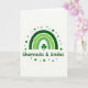 This greeting card features a white background with a green rainbow arcing across the center, made of three concentric bands that shift from deep emerald on the outside to bright lime toward the middle. Each band has gentle, swirling textures that give it a soft, inviting look, like something you’d linger over with a close friend. Above the arc, a scatter of small green dots forms a light halo, like confetti or dew catching the light, adding a flirty sparkle 💚. Centered under the rainbow sits a classic three-leaf shamrock in rich green, grounding the scene with a steady, lucky charm ☘️. Beneath the shamrock, the phrase “Shamrocks & Smiles” appears centered in rounded green lettering, easy to read and friendly in tone. The spacing keeps the artwork and text comfortably balanced, leaving plenty of white space that makes the greens stand out. The rainbow’s upper curve is ringed with dots in several shades of green, from darker forest tones to pale mint specks.