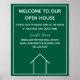 A modern real estate open house welcome poster in minimalist green and white. Customise this realty agent signage with your custom realtor information and details above the simple line drawing of a home and use this to advertise your open house.