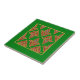 A stylish square ceramic tile with a 'fleur-de-lys' pattern in deep red and gold on a dark green background, from a digitally painted design by Judy Adamson.
