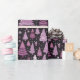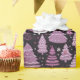 Featuring a chic black background, this wrapping paper sets the stage for a delightful Christmas scene. Adorning the deep black canvas are super cute Christmas trees in shades of purple and white, each exuding a playful and festive atmosphere. These charming trees are complemented by intricate and delicate snowflakes, which add an enchanting touch to the design.