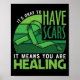 Design features a green awareness ribbon and reads 'It's ok to have scars it means you are healing' and support mental health awareness because therapy is cool in May mental health awareness month.