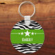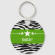 Trendy and modern Sassy Star Zebra Keychain featuring a chic black and white zebra print background and a bold chartreuse green border adorned with a fun star motif. This girly design may be customised with the personalised text of your choosing. Click "Customise It" to find more personalisation options.
