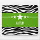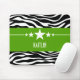 Trendy and modern Sassy Star Zebra Mousepad featuring a chic black and white zebra print background and a bold chartreuse green border adorned with a fun star motif. This girly design may be customised with the personalised text of your choosing. Click "Customise It" to find more personalisation options.