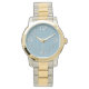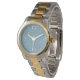 This men's watch has an art deco design of green half circles connect with lines on a field of blue.