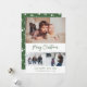 Custom green Merry Christmas photo cards featuring three photos with a hand-lettered title on the front and green background with falling snow and stars at the back. Easily personalize these green script Christmas photo cards with your images, a family name and the year.