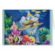 Silk painting of a green sea turtle and friends. Little gold fish, angel fish and others share the sea with colourful seaweeds and corals. Fun and bright for aquariums, gift shops, gifts and cards.