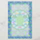 A green sea turtle with patterned shell, against a blue water/wave pattern, with several colourful fish. Circular design with a green border. Unlined stationery.