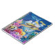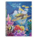 Silk painting of a green sea turtle and friends. Little gold fish, angel fish and others share the sea with colourful seaweeds and corals.