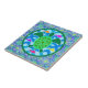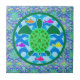 A green sea turtle with patterned shell, against a blue water/wave pattern, with several colourful fish. Circular design with a green border. Sea turtle art. Sea turtle design from wingedturtle.com.