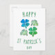 Green Shamrock Clover Happy St. Patrick`s day Postcard. St. Patrick`s day postcard. Four shamrocks in different green shades. Happy St. Patrick`s day for your family, friends and others. Clovers with four leaves for the luck.