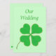 Painting of a green shamrock, four leaf clover, trimmed in gold dots, printed on wedding invitations. Easily customise the text on the template forms.