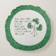 A chic Round Pillow or Cushion, with green Shamrock leaves and a Welsh saying in Celtic scripts, on a White background, surrounded by a ditzy Shamrock pattern. Part of the Posh & Painterly 'Shamrocks' collection.