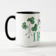 A fun black and white Ringer Coffee Mug with green Shamrock leaves and 'Proud to be Irish' in Celtic scripts. Part of the Posh & Painterly 'Shamrocks' collection.