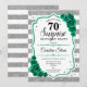Surprise 70th Birthday Party Invitation. Feminine emerald green design with faux glitter silver. Features white and silver stripes, roses, script font and confetti. Perfect for an elegant women's bday celebration. Can be personalized to show any age. Printed Zazzle invitations or instant download digital printable template.