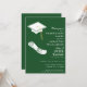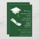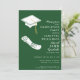 This simple graduation party invitation features a graduate's hat and diploma illustrations and template to personalise the invite with the grad's name, year, school name, date, place, and RSVP data. This design is in green and white colours.