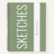 Soft muted green and white personalised notebook sketchbook for your sketching, artwork, and drawings, with a huge large print title of "Sketches by... and your name" printed directly on the cover in modern bold letters. ©PaperGrape, all rights reserved.