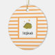 Elegant, modern and cute baby photo round ornament on orange stripe pattern. This template featuring an adorable illustration of Green baby dinosaur sleeping under the gold yellow stars with custom Baby's name. Great for both baby boy and girl. Perfect gift for all seasons!