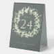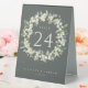 A dark grey green tented sign for wedding table numbers, featuring hand painted snowberries and eucalyptus arranged into a beautiful botanical wreath. All text is fully editable. Other designs, table number products and coordinating items are available in my store.