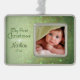 Festive holiday keepsake ornament featuring inset area for your personal photo with opaque band and custom text graphic, sparkly star embellishment and space for your custom text on a green and gold sparkly background.