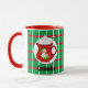 Whether your beverage of choice is hot chocolate, coffee or tea, this holiday mug is for you. The design has a green background with red and white lines that form a pattern of squares. On the from and back of the mug there is an image of a mug of hot chocolate.