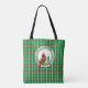 This design has a green background with red and white lines that form a pattern of squares. In the centre there's a white circle with an evergreen wreath and Cardinal.