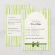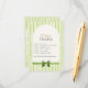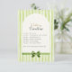 Wedding timeline cards in fresh green stripes detail your event schedule—cocktails, dinner/toasts, cake cutting, dancing—with dress code, perfect as save the date enclosure or invitation insert. Back includes customizable hotel block info and QR code for RSVP/travel details. Easily coordinate with products from our Green Stripes Wedding Suite.