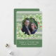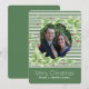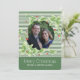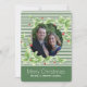 Festive flat Christmas greeting card done in a green and white horizontal stripe pattern, with a round cutout for your photograph. Graphics of pretty light green holly with red berries, decorate around the picture area. Personalise the white text, at the bottom of the card, and add your own photograph. Matching products are available.