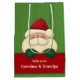 Red with green stripes and a cute Santa on a festive gift bag for the holiday season with custom text for you to add a name or message for a personal touch.