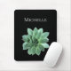 Green succulent mouse pad, with a desert botanical image set on a black background. With white customisable lettering, you can personalise with your own name. Great for adding a botanical touch to your home office.