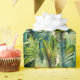 This is a pattern of green and teal watercolor tropical palm leaves on a light beige background.