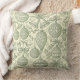 A vintage-style green toile seamless pattern throw pillow featuring intricately illustrated Christmas bells, holly branches, pine sprigs, ribbons, and ornaments on a soft cream background. The elegant monochrome linework evokes a classic holiday charm, reminiscent of Victorian Christmas decor. This pattern blends timeless elegance with nostalgic seasonal spirit.