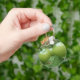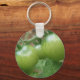 This beautiful keychain features a photograph of a bunch of unripe green cherry tomatoes growing on a tomato plant in a suburban garden. The photograph was taken using macro photography for a detailed result.