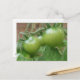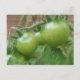 This beautiful postcard features a photograph of a pair of unripe green cherry tomatoes growing on a tomato plant in a suburban garden. The photograph was taken using macro photography for a detailed result.