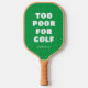 A subtle pattern of green dots on a green background has funny, white, text that reads "too poor for golf" with personalised name text below it make this pickle ball paddle a fun gift for anyone that loves the game and isn't a golfer but still enjoys the country club scene.