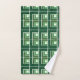 This towel set has a geometric design made from Ls in shades of green laid in different directions repeating across the design.