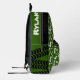 Bold stylised tractor graphic and wheat personalised add your own name repeat patterned racksack backpack bag in country green, white and black. Ideal for boys or girls those who like farming and tractors. Customise with your own choice of short name all over currently reads Ryland and your school or family name or just your name at the top of the bag. The background colour can also be changed if required, currently green. Original art and design by Sarah Trett for www.mylittleeden.com