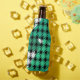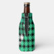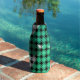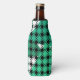 This bottle cooler has a mid-century modern design of solid black diamonds inside black diamond outlines with triangles in shades of seafoam green under them, all on a field of white.