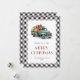 Custom retro black and white buffalo plaid Christmas cards featuring a green truck. Easily personalise these snowy watercolor green truck Christmas cards with your family name.
