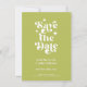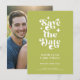 A Modern Retro Typography over a citrus green background, Photo Wedding Announcement Flat Card. With a unique typography "save the date" on the front, with names and date in a simple and minimal design on the back, add your wedding website for event details. The couple's photo is a full-frame photo. A unique and affordable Wedding Save the Date for couples on a budget. Choose prints and/or a digital announcement download.