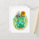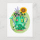 Clovers, daisies, and a bright yellow sunflower add to the ornate decor of a whimsical green watering can dwelling. Original illustration by Noël Snow.