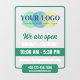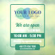 Put this open hours decal on your storefront to let customers, clients, and passers-by know when you're open and how to contact you. Personalize with your business logo, phone number, and website. The open hours window cling has a clear and modern design in white and green to be easily read and eye catching.