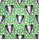 Green fabric with cute badgers against a paint dab pattern. Perfect for your nursery projects!