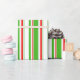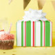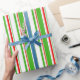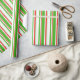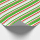This wrapping paper design features a Christmas and holidays themed red, white, and green coloured stripes pattern. Wrapping paper like this might be fun to use when preparing gifts being given in celebration of a birthday, a wedding, an anniversary, or some other event.