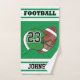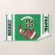 Hand Towel. Featuring a green background with white jersey stripes and a football and football player's helmet. To complete the design is an area to add a name and sport number which will make the perfect gift for the sport enthusiast in your life. ✔Note: Not all template areas need changed. 📌If you need further customisation, please click the "Click to Customise further" or "Customise or Edit Design" button and use our design tool to resize, rotate, change text colour, add text and so much more. ⭐This Product is 100% Customisable. Graphics and / or text can be added, deleted, moved, resized, changed around, rotated, etc... ⭐99% of my designs in my store are done in layers. This makes it easy for you to resize and move the graphics and text around so that it will fit each product perfectly. 📌 (Please be sure to resize or move graphics if needed before ordering) You can also "TRANSFER DESIGN" on other Zazzle products and adjust the design to fit most of Zazzle items. (button is down on the right side of the page) This design is made with high resolution vector and/or digital graphics for a professional print. 📌NOTE: (THIS IS A PRINT. All Zazzle product designs are "prints" unless otherwise stated under "About This Product" on the left side of this page) The design will be printed "EXACTLY" like you see it on the screen and on the product...so please make sure when you do your changes on the resizing of any of the graphics or text that it fits in the areas correctly and that your spelling and wording is how you like it to be in size, colour and font. If you have any questions about the "DESIGN ONLY" or need help please contact me at ✉ siggyscott@comcast.net or visit my store link: https://www.zazzle.com/store/designsbydonnasiggy (Copy and Paste) I'll be happy to help. 📌 ALL OTHER QUESTIONS (shipping, refund, the printing, the product, etc...) please contact Zazzle or the Maker ⭐DIRECTLY⭐. Thank you for the support and stopping by my store - DesignsbyDonnaSiggy. © Donna Siegrist⭐⭐⭐ ZAZZLE promises 100% satisfaction. If you don't absolutely love it, Zazzle will take it back! ⭐⭐⭐ 1-888-8ZAZZLE (1-888-892-9953) Phone hours: Mon - Fri: 9AM - 5PM PT (12PM - 8PM ET)